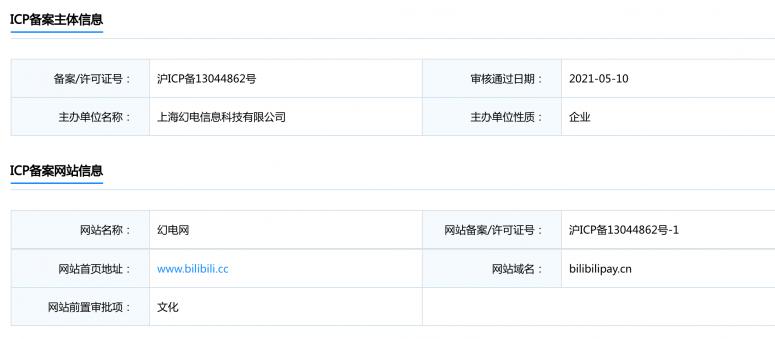 工信部ICP/IP地址/域名信息备案管理系统显示,B站关联公司上海幻电信息科技有限公司于2021年5月通过了对“bilibilipay.cn”和“bilibilipay.com”的审核备案。