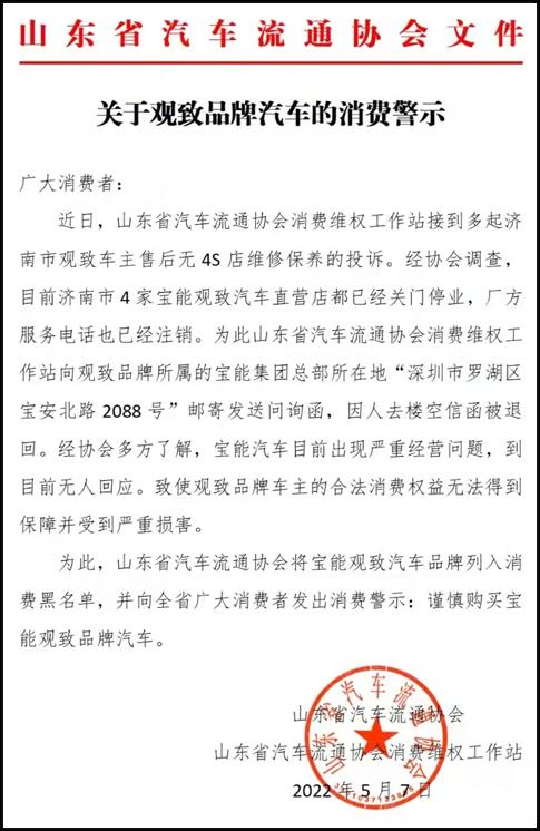 5月7日,协会将宝能观致汽车品牌列入消费黑名单,并发出警示:谨慎购买观致品牌汽车。
