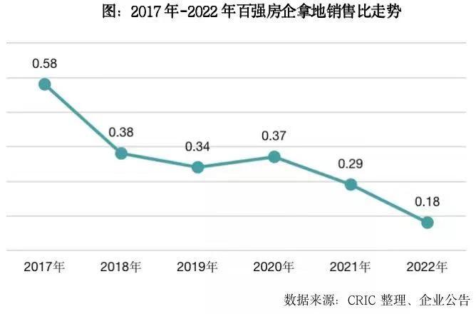 来自克而瑞的统计显示,2022年全年百强房企拿地销售比仅有0.18,创2017年以来的最低水平,有超过四成百强房企当年投资几乎暂停。