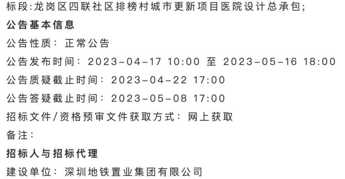 早在3月,“深圳地铁集团”旗下的深铁置业就已进驻位于龙岗区的排榜村城市更新项目,这个项目此前由恒大和深圳本地民企桑泰所有。近日,深铁置业公开招标设计总包商,意味着排榜村旧改的开发商正式变更为深铁置业。