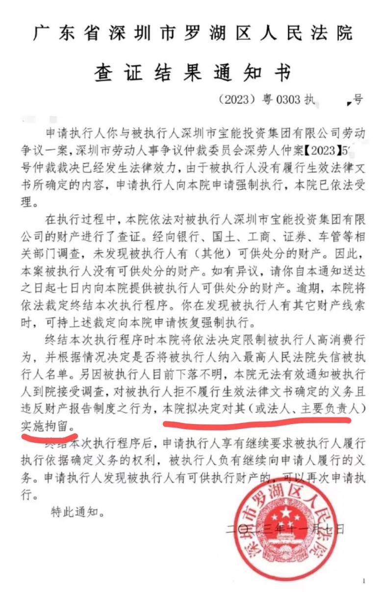 11月10日,腾讯新闻报道深圳市罗湖区法院一则《查证结果通知书》显示,因宝能投资拒不履行生效法律文书确定的义务且违反财产报告制度之行为,“本院拟决定对其(或法人、主要负责人)实施拘留。”
