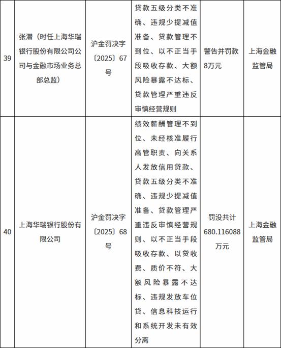 2月8日,国家金融监督管理总局上海管理局公布了2025年以来的48张罚单,总计罚没金额超1700万元,多家银行领到超百万元罚单。其中,罚没金额最多的一张罚单来自上海华瑞银行股份有限公司,共计罚没680.11万元,时任上海华瑞银行股份有限公司公司与金融市场业务总部总监张潜被警告并处以8万元罚款。