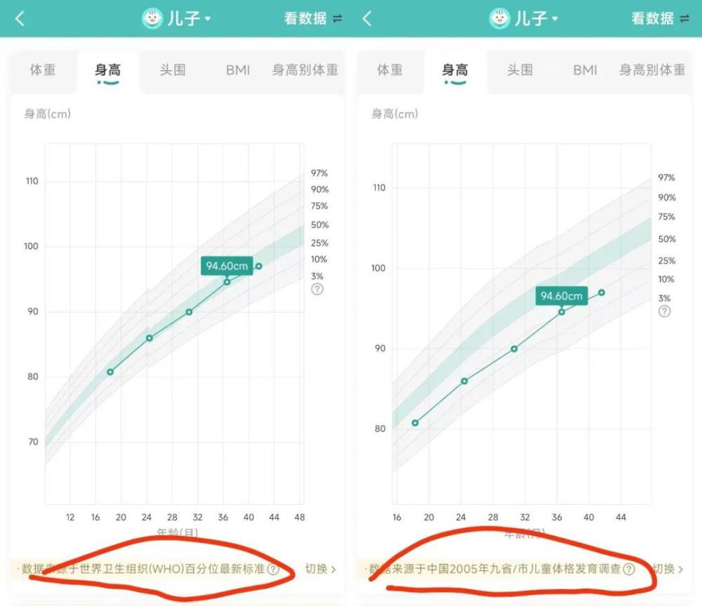 某育儿APP中,切换参考标准后,陆旭儿子的身高就从中等变成了偏矮(受访者提供)