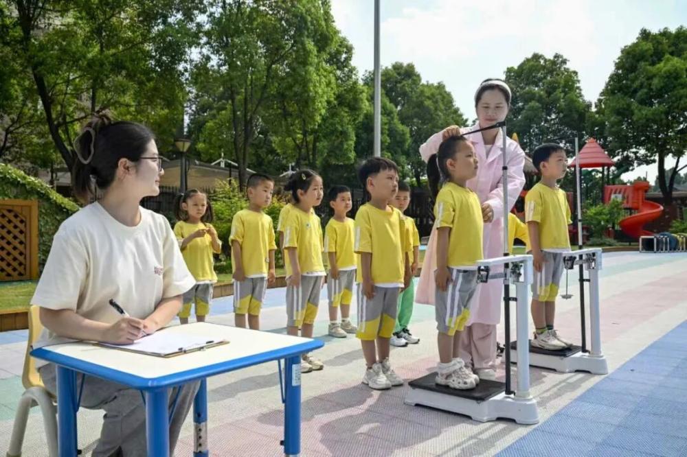 安徽合肥的一家幼儿园内,小朋友们正在测量身高