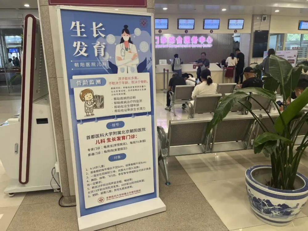 暑假期间,北京一家三甲医院候诊大厅挂出生长发育门诊的信息牌(摄影/卢伊)