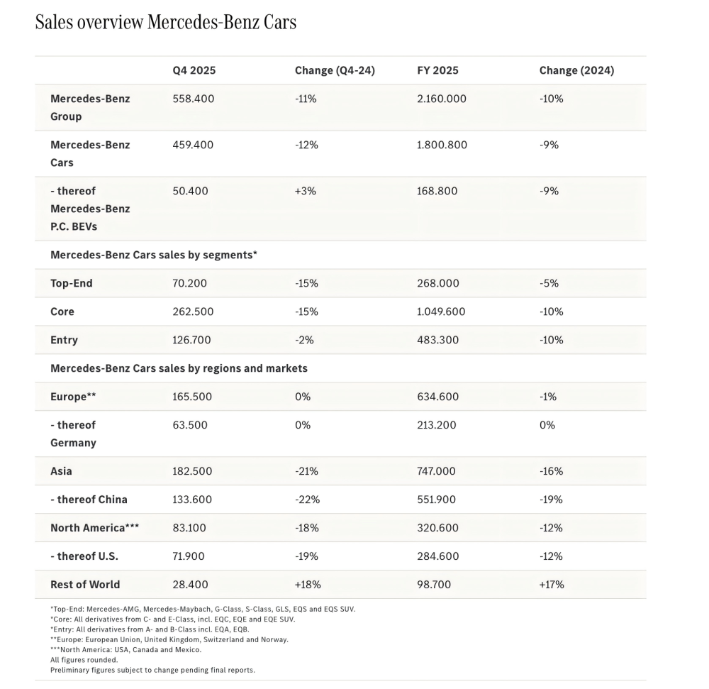 欧洲市场是梅赛德斯-奔驰集团销量最平稳的区域,2025年交付新车63.46万台,同比仅下滑1%;德国市场交付量达到21.32万台,同比基本持平。
