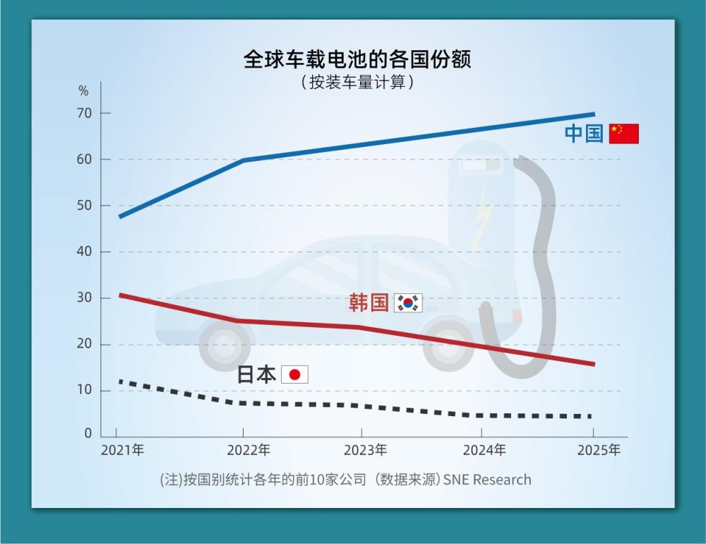 在纯电动汽车(EV)用电池领域,中国企业的市场份额正在增加。2025年超过七成,与2021年的近五成相比,垄断进一步加强。在全球EV需求放缓的背景下,最大企业宁德时代在中国和欧洲扩大订单,刷新利润新高。与在主要的美国市场陷入苦战的韩国企业相比,领先优势扩大。
