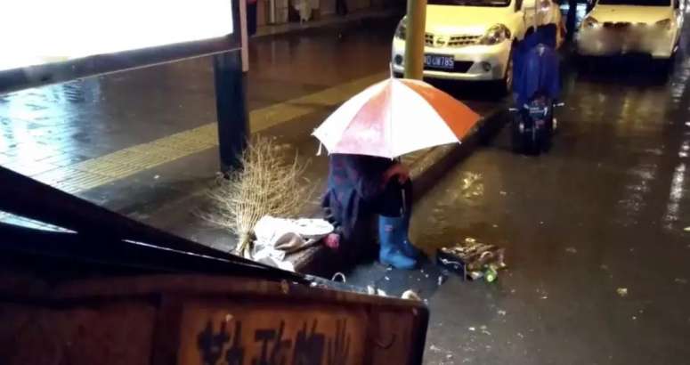 雨夜,一位老奶奶打着伞,独自坐在马路牙子上。