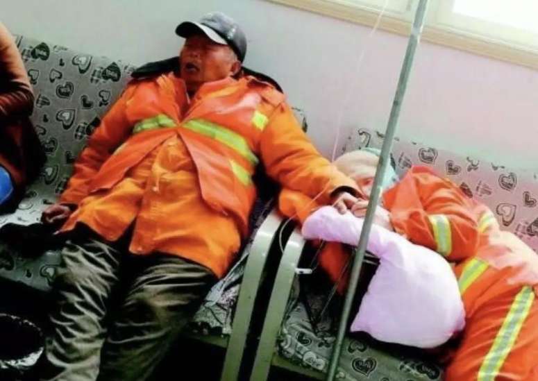 输液室,一位身穿环卫服的老人正在输液,旁边同样身穿环卫服的老人握着他的手,安静地睡着了。
