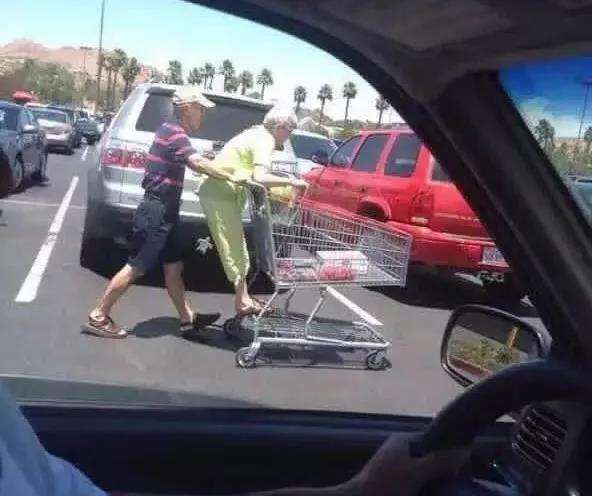 调皮的奶奶乘上了超级无敌拉风的购物车,爷爷则一脸宠溺地推着车。
