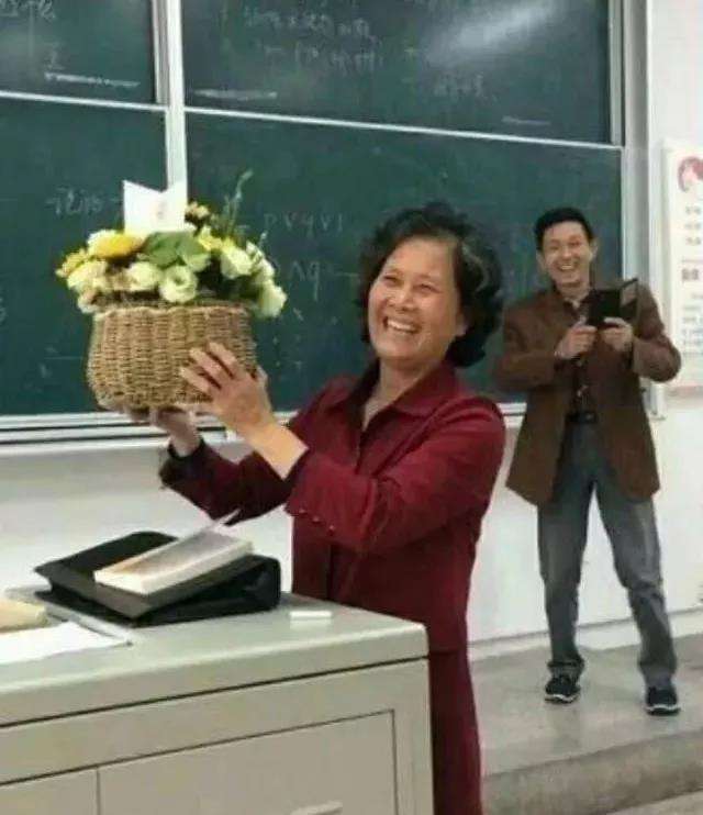江苏盐城,大学教师何海芹退休前的最后一节课,老伴特地带着花,来迎接妻子下班。