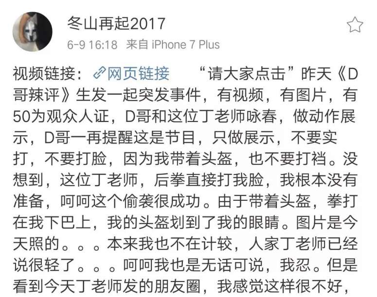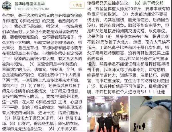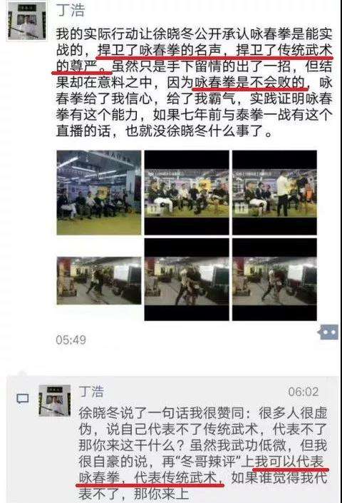 第二天,丁浩便发朋友圈,认为自己击败了徐晓冬,捍卫了传统武术的尊严,咏春是不败的,并表示自己“可以代表咏春拳,代表传统武术”。