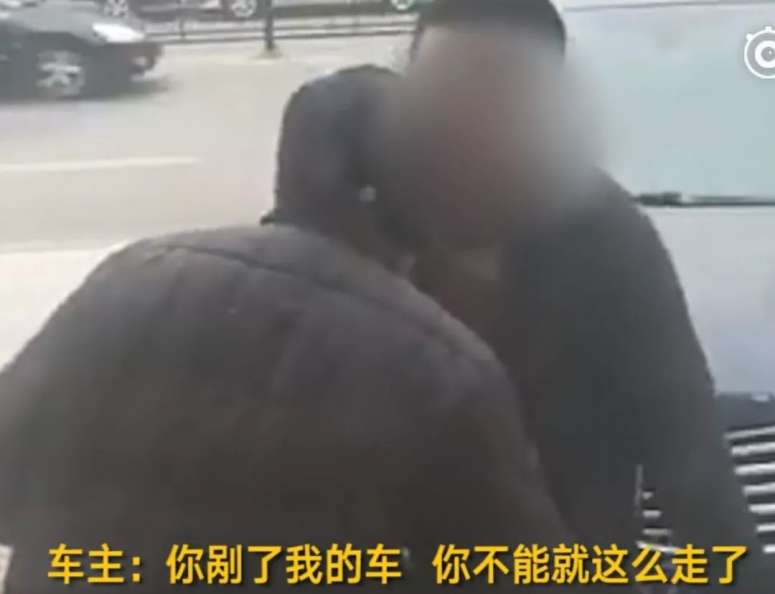 山东一位91岁的老人,骑着三轮车剐花了别人的林肯车后,打算离开,被车主拦下了。